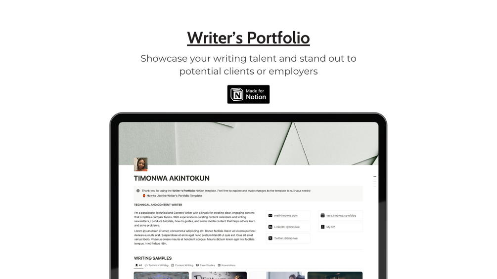 Writer's Portfolio is a versatile Notion template designed to help writers showcase their talent, skills, and expertise easily. Whether you're a content creator, storyteller, technical writer, or any type of writer, it is the ultimate solution for creating a professional online presence.