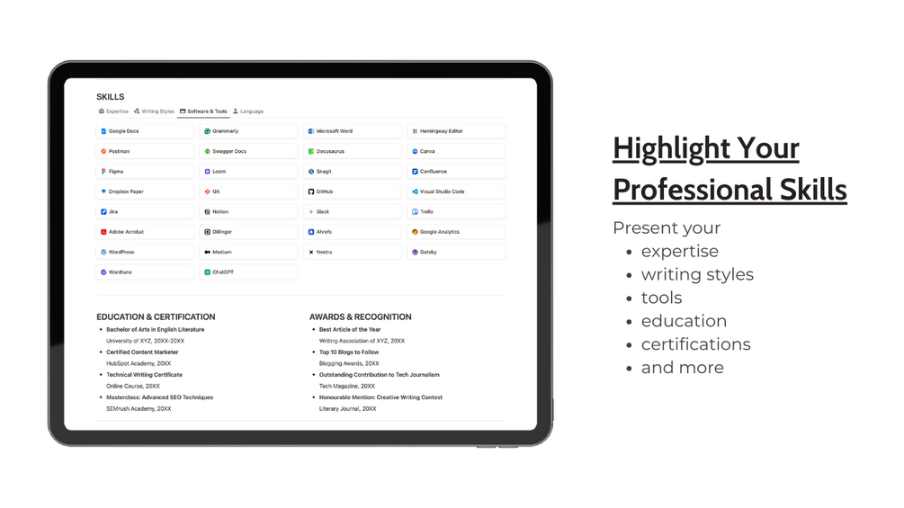 Highlight your proficiency across various writing styles, software tools, and languages, and let your skills shine through. Whether you're an expert in content creation, ghostwriting, or academic writing, Writer's Portfolio allows you to effortlessly demonstrate your versatility and expertise.